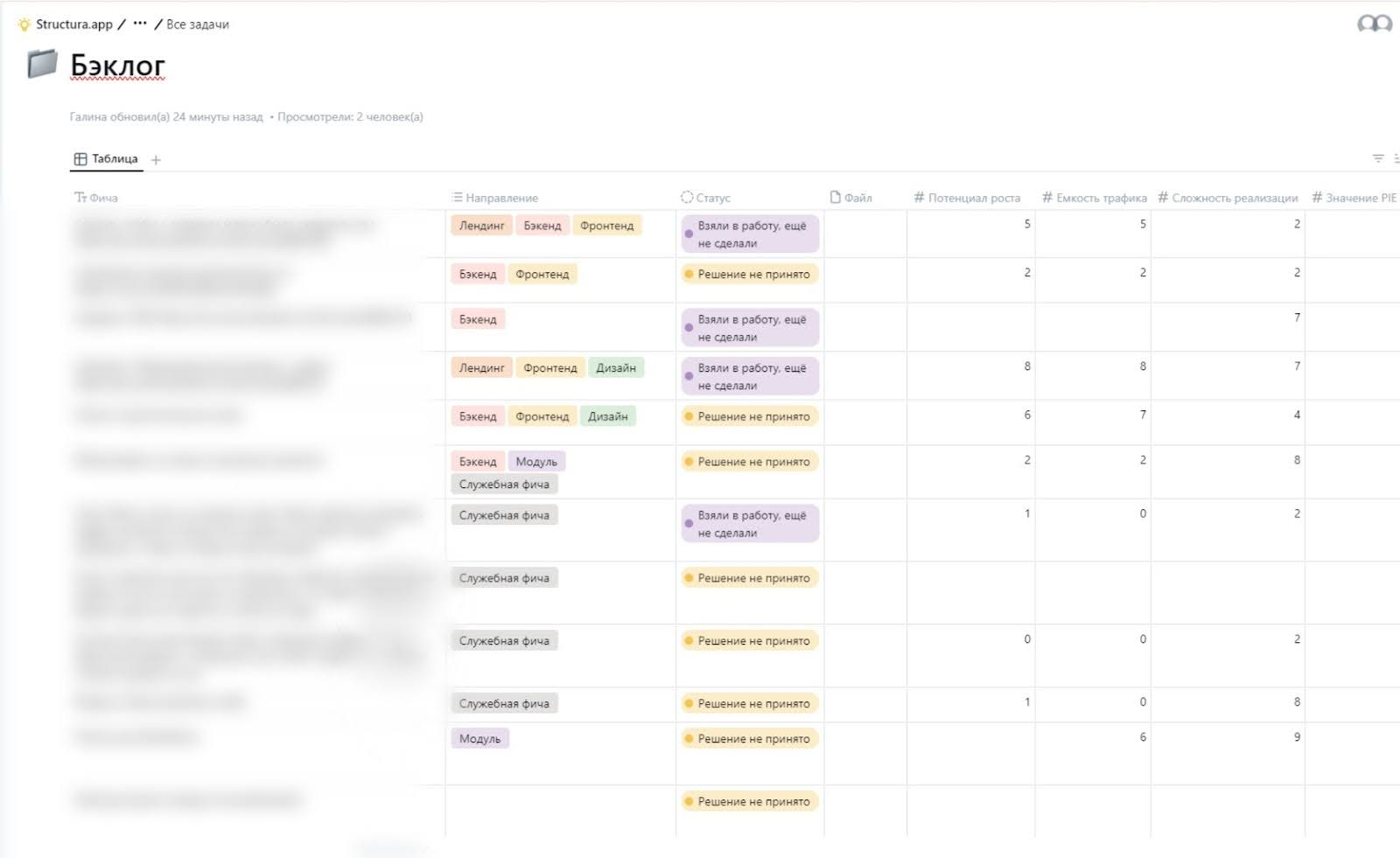 Вот так выглядит бэклог проекта. Сюда попадают идеи, которые мы обсуждаем с командой на брейншторме, а также те, которыми делятся наши пользователи в обратной связи по работе с сервисом.